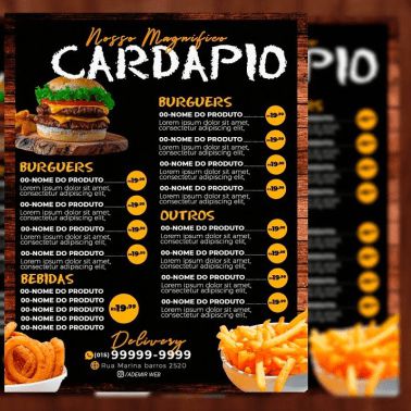 Arte para impressão de Cardápio em alta qualidade. Receba o arquivo em Corel já pronto para impressão. Envie as configurações e as dimensões da sua gráfica de escolha e pronto! Enviamos a arte em até 5 dias úteis após a confirmação do pagamento.